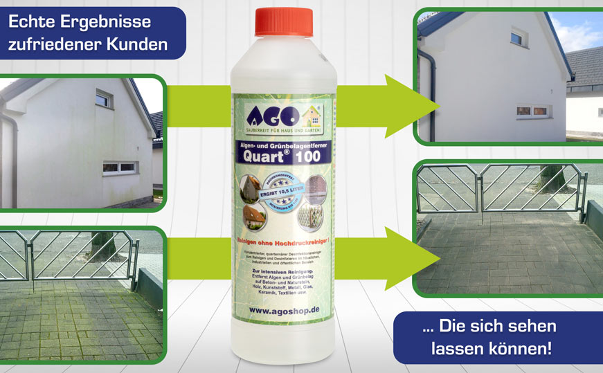 Überzeugen Sie sich von den direkten Erfahrungen unserer Kunden und deren Reinigungsergebnissen im Bereich „Kundenbilder“. In der neuen Rubrik „Ratgeber“ lesen Sie, wie Sie mit AGO Quart Ihre Terrasse reinigen, eine Fassadenreinigung selber machen, Grünbeläge vom Dach entfernen oder Algen in Teichnähe entfernen.