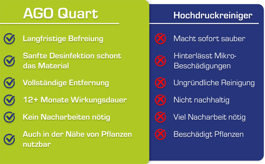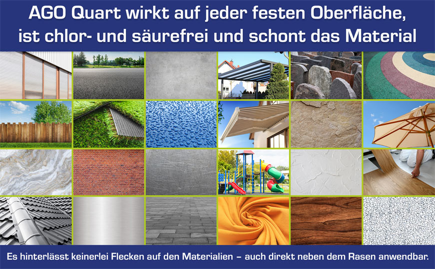 - AGO Quart wirkt in der Fläche, kann nicht zur Moosbeseitigung in Fugen und Ritzen verwendet werden.