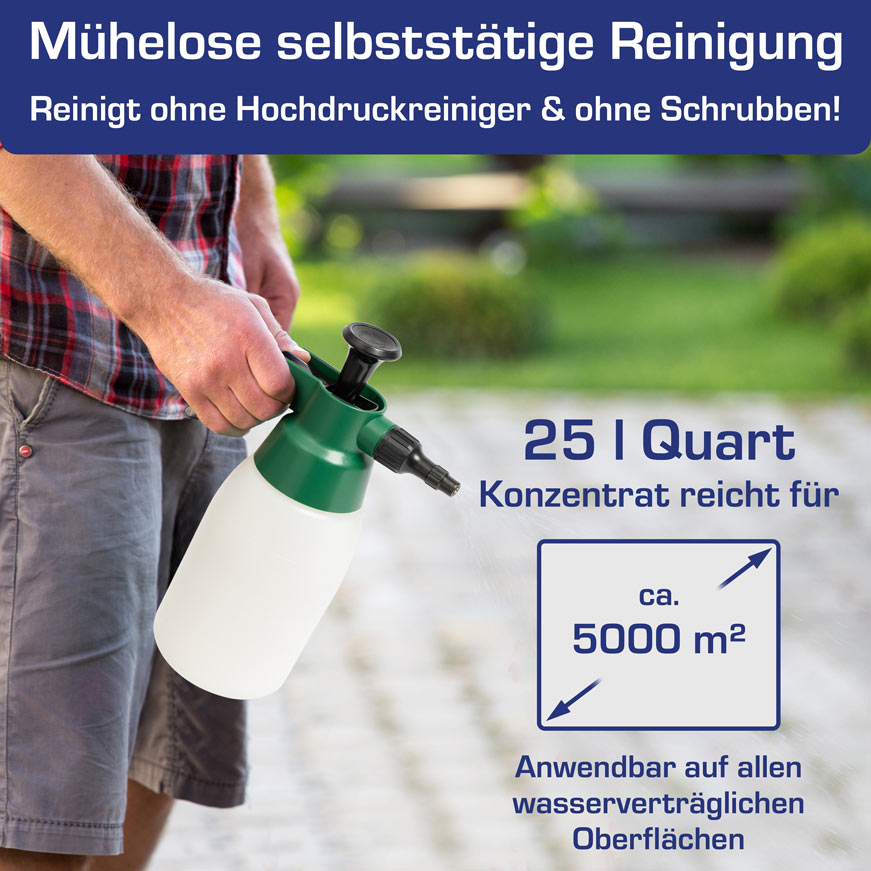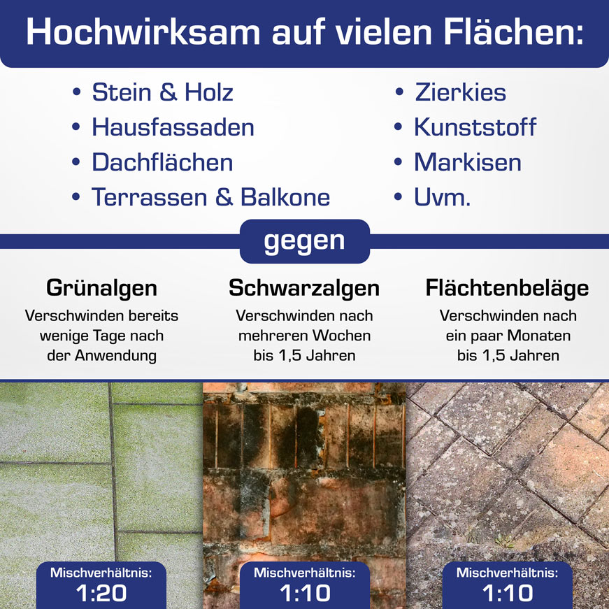 - entfernt alle Algen, Grünbeläge und Flechten von jeder wasserfesten Oberfläche