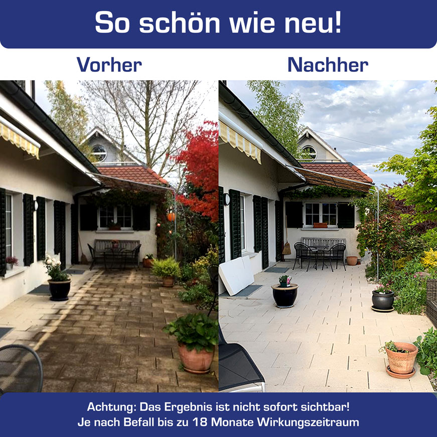 Der Einsatz von Hochdruckreinigern oder mühsames Schrubben / Abwaschen erübrigt sich. Unsere Flechten- und Algenentferner sind extrem wirksam!
