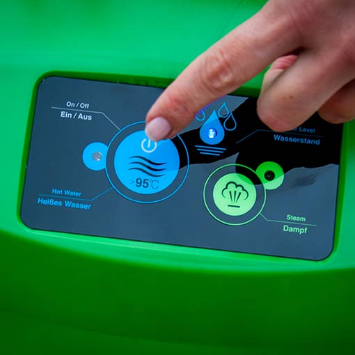 Er hält die Heißwassertemperatur konstant auf über 90 °C. Diese Regelung haben wir uns patentieren lassen. Heißwasser dicht am Siedepunkt zerstört mit Sicherheit die Zellpflanzen, was die Fotosynthese unterbindet und die Pflanze folglich vertrocknen lässt.