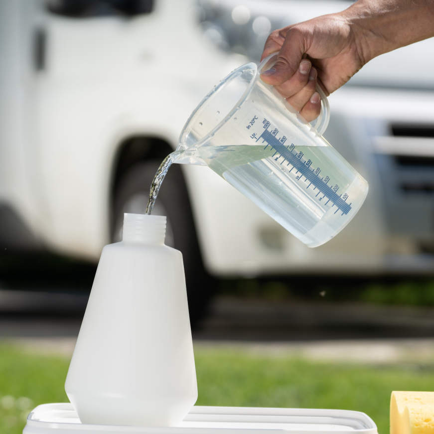 Die zuvor eingefüllten 100 ml AGO Kraft Camping Reiniger Konzentrat mit dem Messbecher in den Behälter mit Wasser einfüllen.
