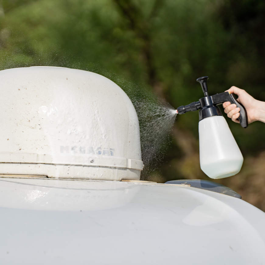 Die Anwendungslösung mit Hilfe des AGO Druckpump-Schaumsprühers auf die Flächen auftragen und mit Schwamm oder der AGO Teleskop-Waschbürste waschen.