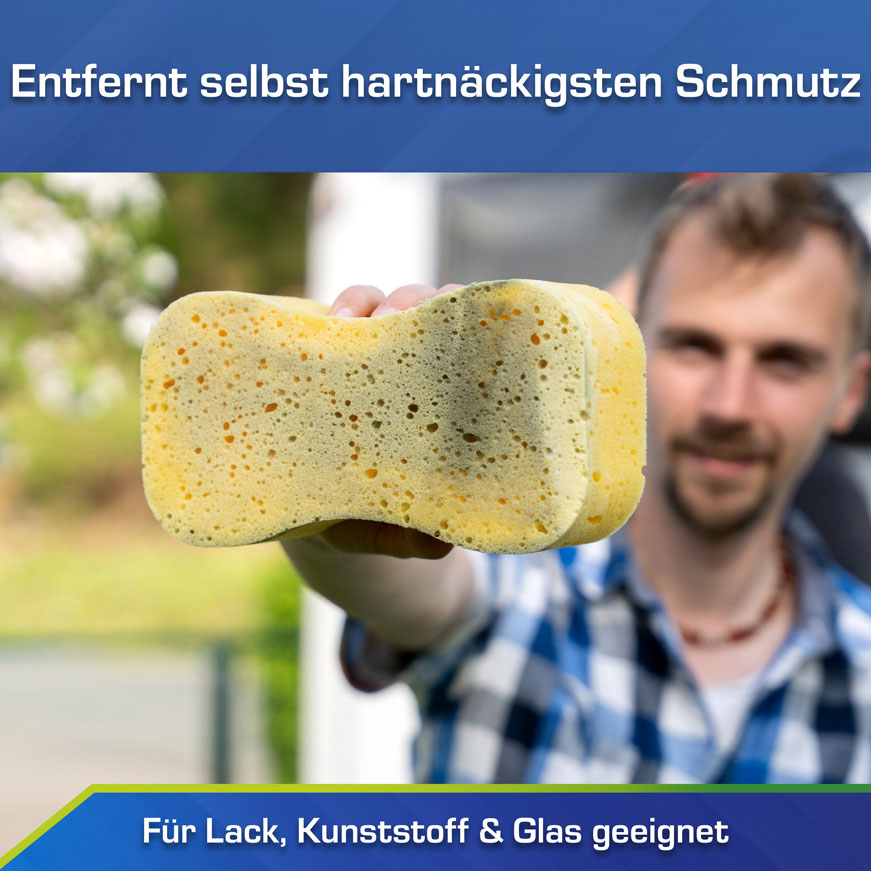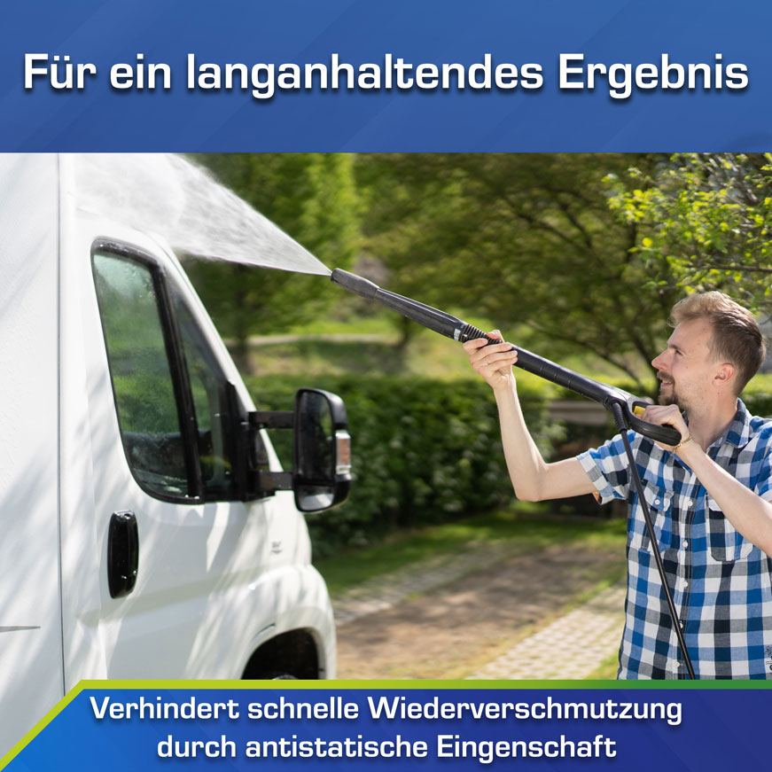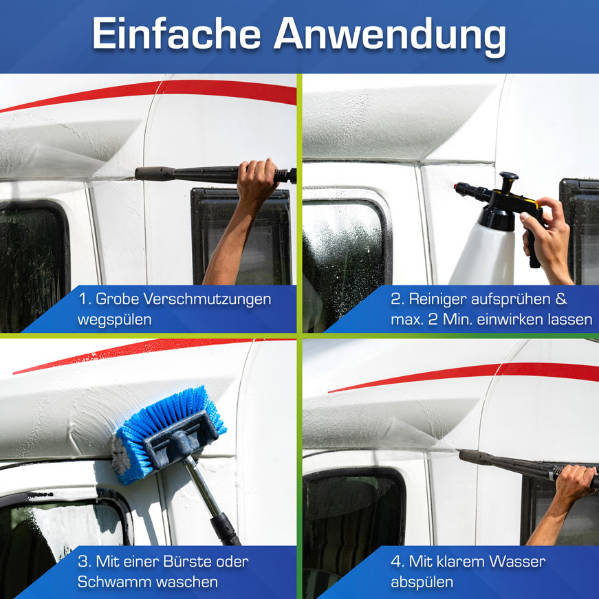 Es kann wahlweise mit dem mitgelieferten Schwamm oder aber auch mit der optional im Online-Shop erhältlichen Waschbürste und Teleskop-Stiel gewaschen werden. Das Ergebnis ist das Gleiche. Ebenfalls gibt es einen XXL-Teleskop-Stiel für die extrem großen Campingfahrzeuge.